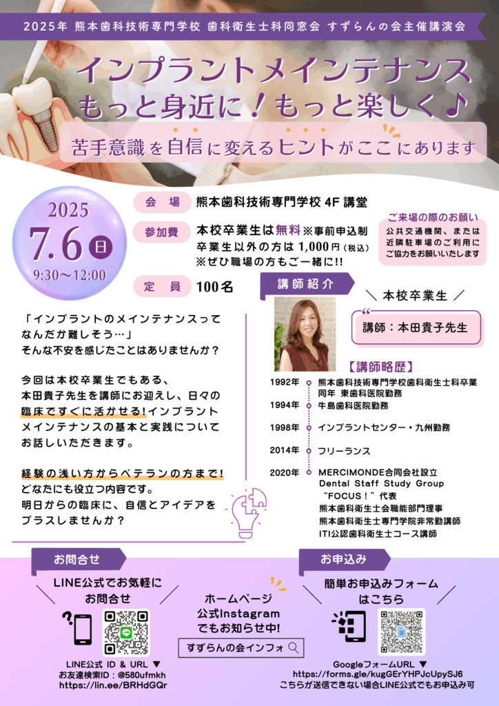 この度7月6日にすずらんの会主催で講演会をする運びとなりました!!今回は卒業生の本田貴子先生を講師にお迎えして、インプラントメインテナンスの基本と実践についてお話しいただきます。経験の浅い方からベテランの方まで!どなたでも役に立つ情報となっています!!ぜひ久々の母校で自信とアイデアをアップデートしませんか??これを機に同窓会もいいですね!!みなさまのご参加を心よりお待ちしております。