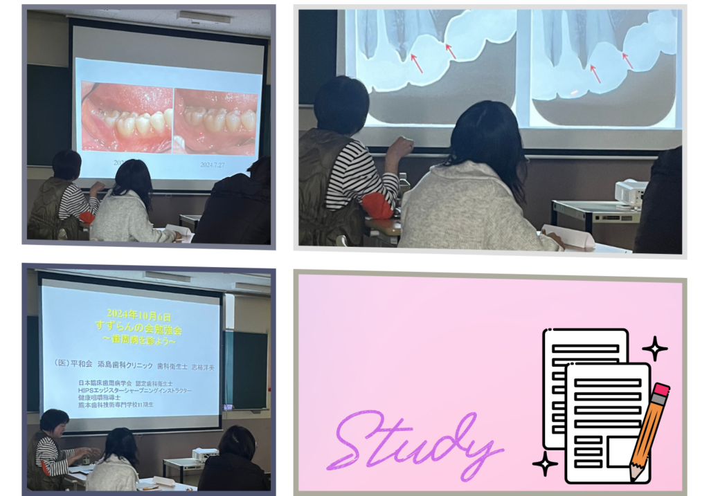 そして、前回聴講で参加してくださったDHがご相談の資料を持参され、こちらも皆さんと見ていきました!!1年目のDHさんですが、しっかり前回の資料採りのポイントを押さえられ、見やすいスライドを作ってきていただきました。初めて担当される患者様ということで、真摯に向き合っていらして感動しました。患者様にも信頼されていると同じ職場の方から伺い、それも納得だなという内容でした。皆さんで考察して、とても勉強になりました。